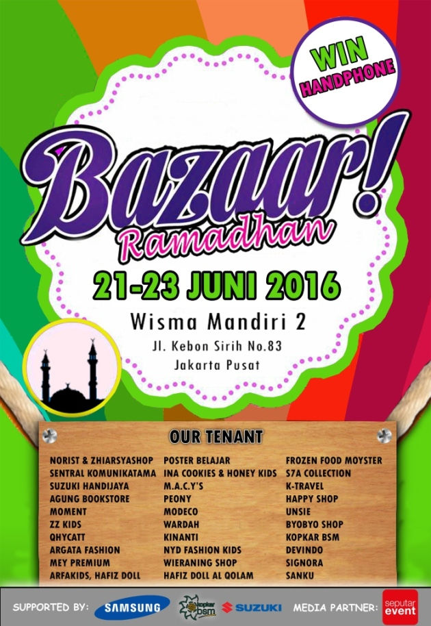 Bazaar RamadhanYudika NababanJun 17, 20161 min readTanggal : 21 - 23 Juni 2016Tempat : Wisma Mandiri 2, Jl Kebon sirih No. 83, Jakarta Pusat#anekapromo #promobazar